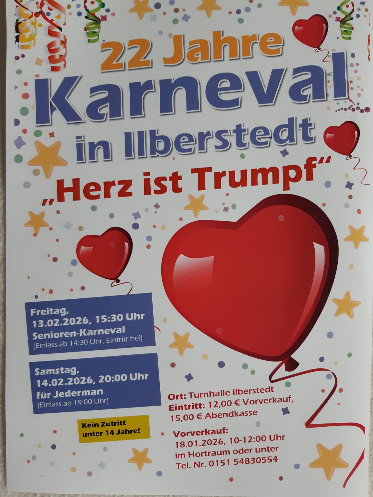 Die IG Karneval lädt zum Karneval für Jedermann in Ilberstedt unter dem Motto "Herz ist Trumpf" ein.